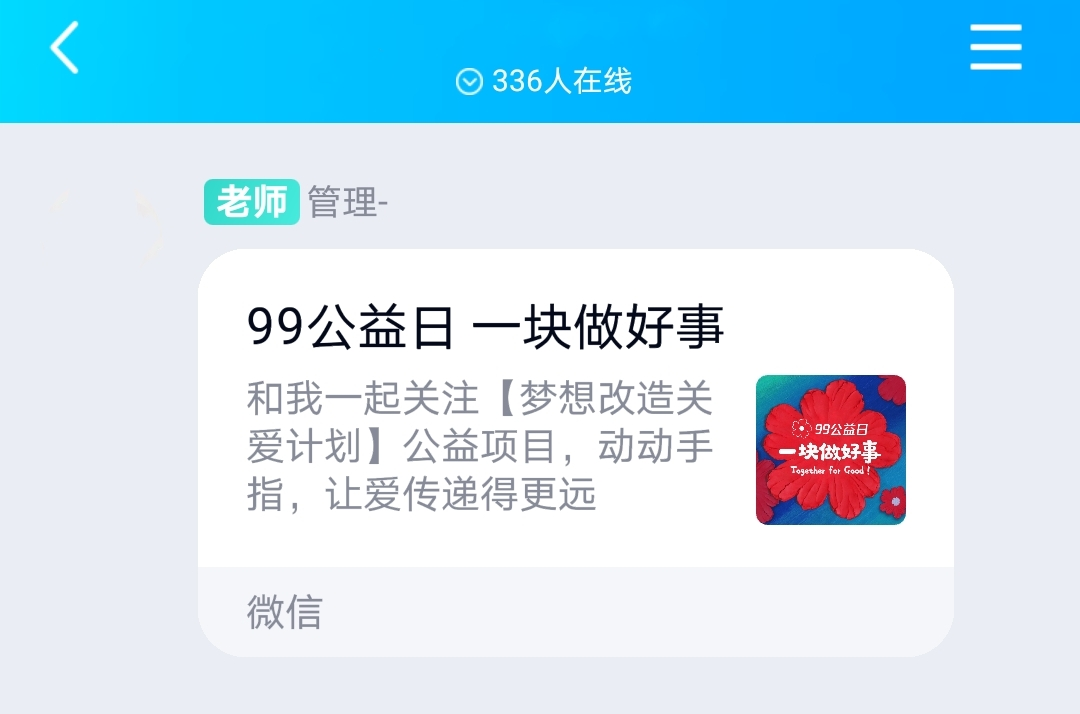 “99公益日”是由腾讯公益联合慈善组织和媒体机构,由中央网信办和国家民政部指导,响应国家9月5日“中华慈善日”的号召,共同发起的一年一度全民公益活动。公司积极组织计算机团队为公益活动捐赠,老师们躬先表率,其次为在员工中普及“99公益日”相关信息,由各班团支书宣传活动,让员工们更加关注社会,了解公益事业。由于这一天很多公益组织将宣传展台摆到腾讯总部,员工们可以选择腾讯公益网络平台上公益项目进行小额捐赠:进行一次对抗雾霾的游戏,便可支持一颗新树苗的种植;捐出你的零散时间和声音,共同为盲童读一本他们最想听的书。公益的方式正变得越来越多元。