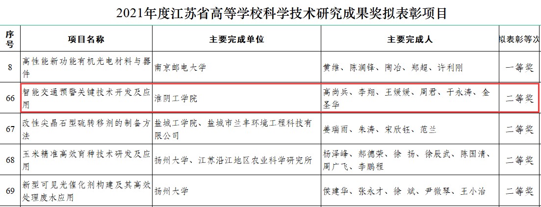 近日,江苏省教育厅公示了江苏省高等公司科学技术研究成果奖,yd222云顶线路检测学科团队(高尚兵、李翔、王媛媛、周君、于永涛、金圣华)申报的“智能交通预警关键技术开发及应用”获得江苏省高等公司科学技术研究成果二等奖。
