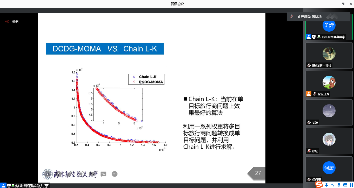 蔡昕烨副教授研究方向为计算智能、机器学习以及上述方法在航空领域的应用。已在IEEE TEVC,IEEE TCYB,IEEE TIP,EVJ,Information Sciences和计算机学报等领域重要刊物共发表论文50余篇,主持国家自然科学基金等国家/省部级科研项目10余项。带领研究团队获得了2017年国际进化计算大会超多目标优化竞赛冠军,并入选了第一届江苏省青年科技人才托举资助。2020年被IEEE SMC企业信息系统专委会和国际信息处理联合会授予杰出青年科学家奖。蔡昕烨博士的面向复杂场景的智能优化方法与应用的报告中,从多目标优化问题出发讨论多目标优化指标设计,并将其研究成果应用于分布式综合模块化航电系统的优化设计和大规模无人机群的协同路径规划中。