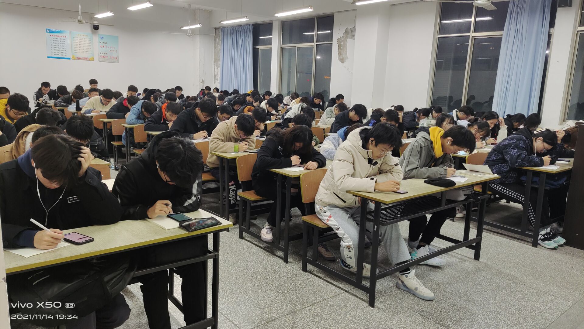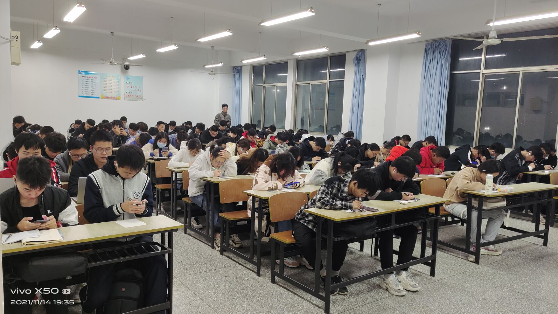 考试开始前,班助对班级同学,详细说明了考试规则,告知了考试题型。在7点前各班同学全部到达指定晚自习教室,以晚自习教室作为考场,班助作为监考人。7点30分,学习通平台准时发放模拟试卷,第一项听力试题也随之而来,所有同学佩戴耳机,班助在教室来协助监督同学们独立完成模拟考试。考试时间紧张,同学们全程都在争分夺秒,认真答题。