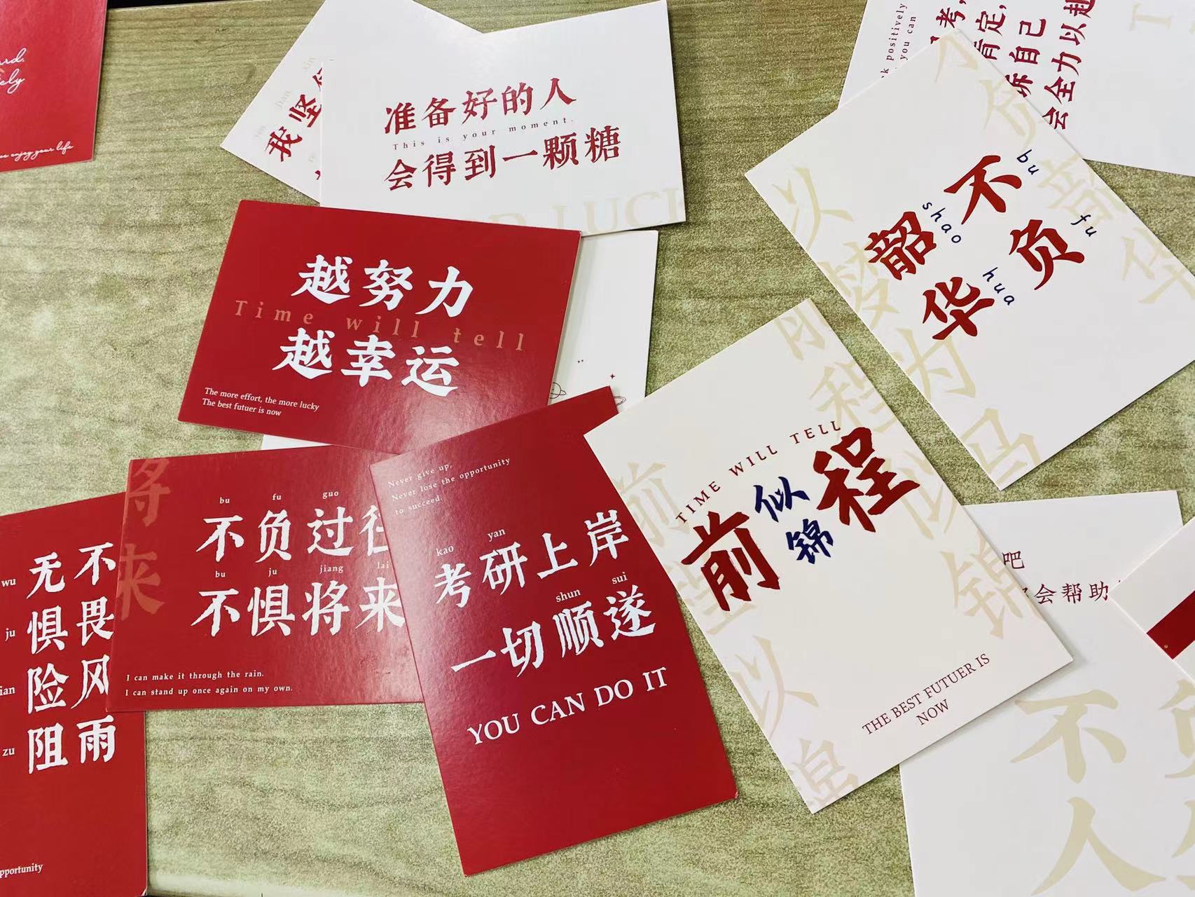 自12月7日启动策划,公司花费一周时间线上线下采购礼品:u盘、书签、钥匙扣、 铜尺、笔筒、 日历、胸针、柿子(柿柿如意)、棒棒糖(你最棒)、苹果(开花结果)、蒙牛牛奶(你真牛)、旺旺饼干(考研旺)、橙子(马到橙功)、考研福袋等;并由辅导员一一手写贺卡,祝福寄语考研学子。