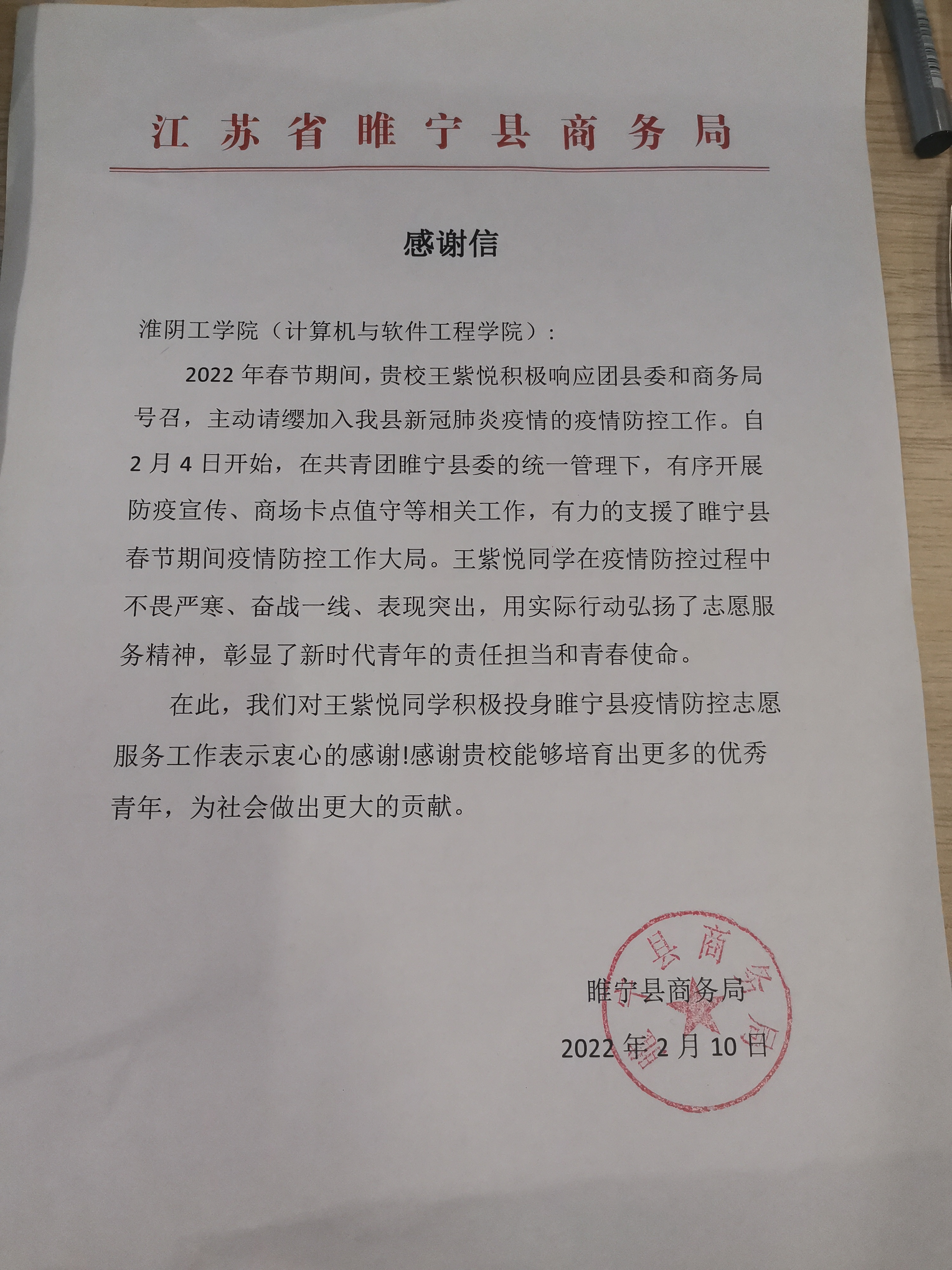 2022年3月,一封来自徐州睢宁县的感谢信,来到了yd222云顶线路检测员工工作办公室:“2022年春节期间,贵校王紫悦积极响应团县委和商务局号召,主动请缨加入我县新冠肺炎疫情的疫情防控工作......王紫悦同学在疫情防控过程中不畏严寒、奋战一线、表现突出,用实际行动弘扬了志愿服务精神,彰显了新时代青年的责任担当和青春使命。在此,我们对王紫悦同学积极投身睢宁县疫情防控志愿服务工作表示衷心的感谢!”