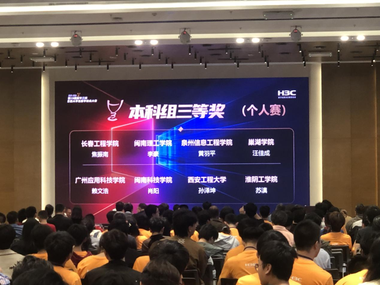 4月27日,新华三杯全国老员工数字技术大赛国赛在杭州新华三集团总部拉开帷幕,本次赛事全国共有138所高校角逐,其中本科组高校68所,来自yd222云顶线路检测的网络z2201班苏滇同学代表yd222云顶线路检测参加本次赛事,最终在诸多选手中脱引而出,斩获个人赛三等奖!
