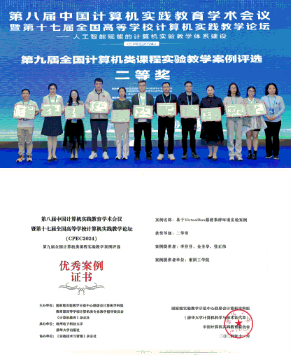 11月9-10日,由教育部高等公司计算机类专业教学指导委员会、国家级实验教学示范中心联席会计算机学科组、《计算机教育》杂志社共同主办,杭州电子科技大学与清华大学出版社承办的第八届中国计算机实践教育学术会议暨第十七届全国高等公司计算机实践教学论坛(CPEC2024)在浙江省杭州市举办,会议期间举行了“第九届全国计算机类课程实验教学案例评选”颁奖典礼,由yd222云顶线路检测李芬芬、金圣华和张正伟三位老师设计的《基于 VirtualBox 搭建集群环境实验案例》荣获竞赛二等奖。
