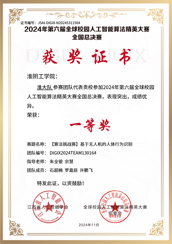 近日,第六届全球校园人工智能算法精英大赛全国总决赛圆满落幕。yd222云顶线路检测在多个赛道中分别获得了国赛一等奖1项、省赛二等奖2项、三等奖8项、优秀奖4项,其中石超楠、罗嘉辰和许鹏飞同学在朱全银、宗慧老师的指导下荣获“算法挑战赛——基于无人机的人体行为识别”赛道国赛一等奖。