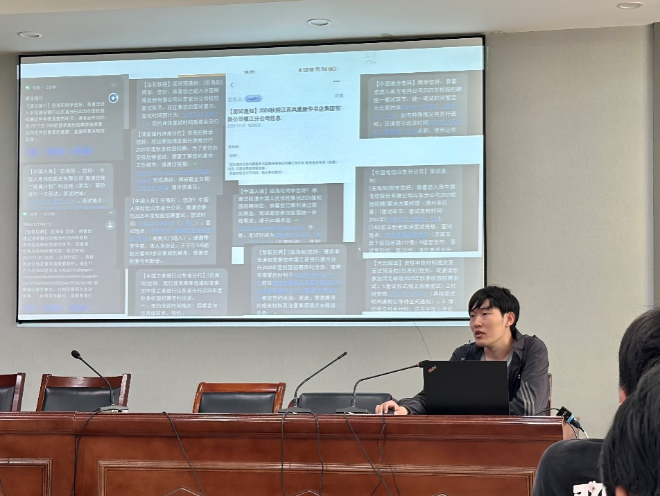 求职就业分享环节中,田海阳以自身求职历程为蓝本,从简历制作、面试技巧到职业规划,提供了全面且极具实用性的建议。他提醒同学们,求职前务必明确目标,依据岗位需求量身定制简历与面试策略,同时积极投身实习实践,以此增强个人竞争力。